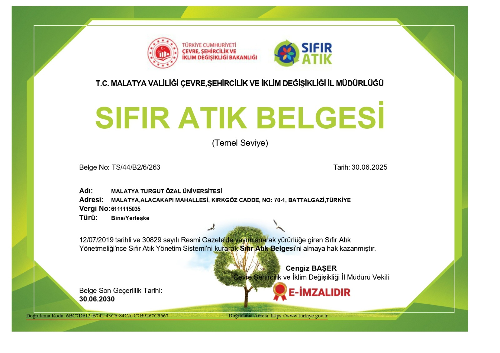 Malatya Turgut Özal Üniversitesi Sıfır Atık Belgesi ...
